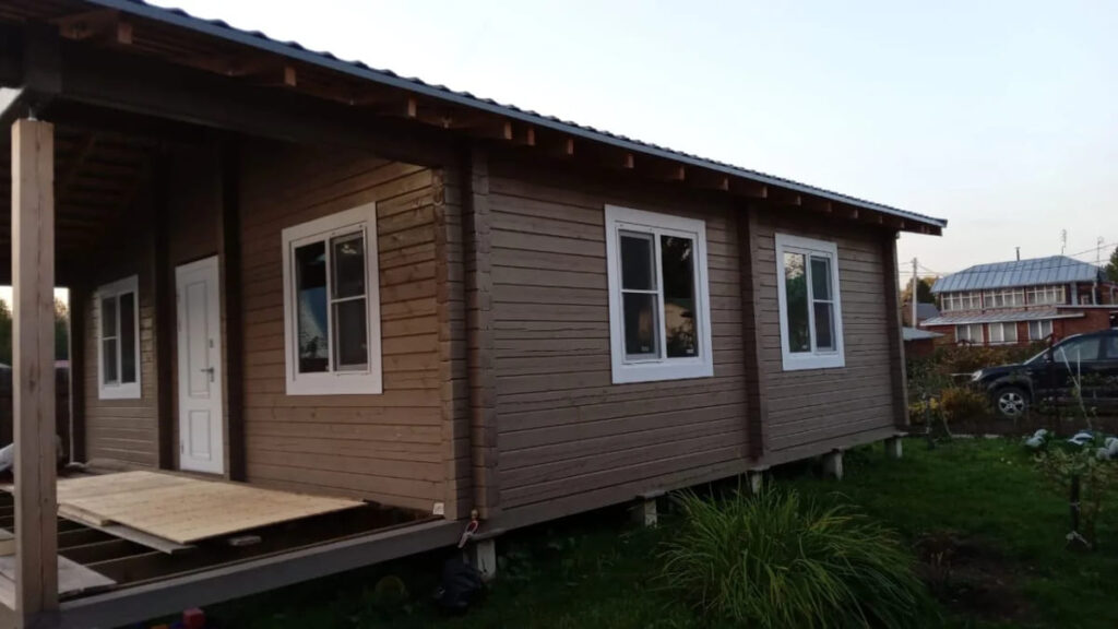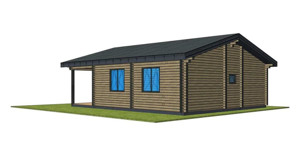 В стоимость входит монтаж стенового комплекта, балок перекрытий, кровлей покрытой металлочерепицей, свайный ЖБ фундамент. Детали стен изготавливаются в заводских условиях, что ускоряет сборку на объекте и минимизирует строительный мусор, так же вы можете приобрести домокомплект для самостоятельной сборки, цена комплекта стен 27 м3 — 661 500 руб.