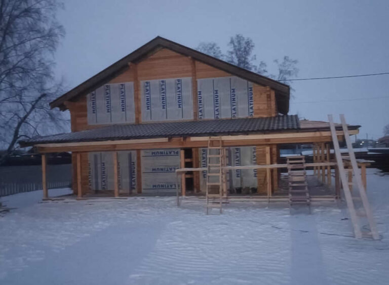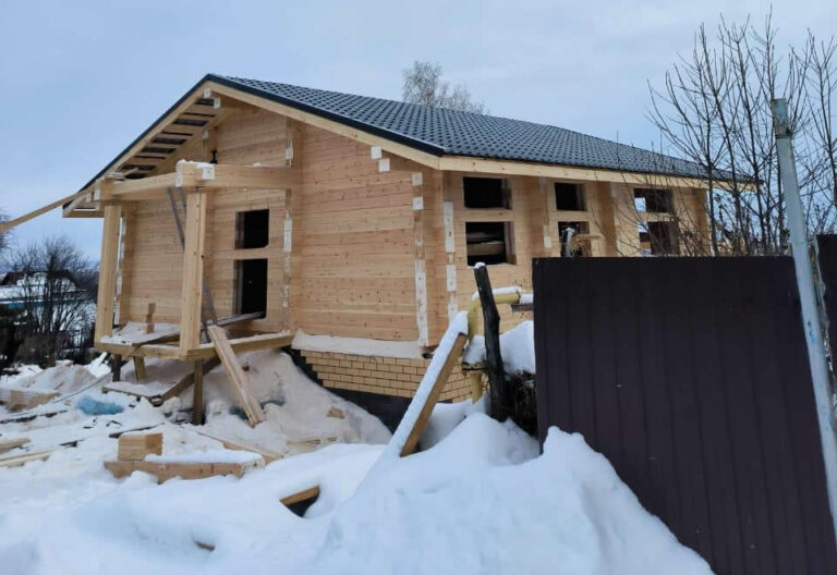 Собираем стены из клееного бруса по проекту. Все элементы точно подогнаны, утеплитель — между венцами.