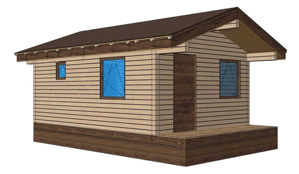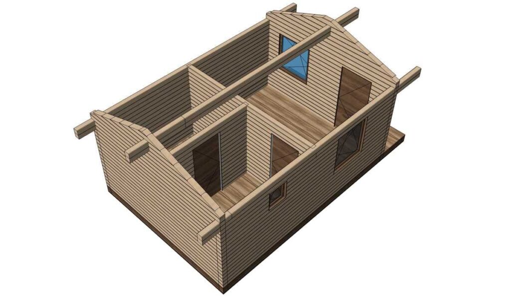 В стоимость входит; монтаж стенового комплекта в теплый угол, обвязка из лиственницы, балок перекрытий, кровли покрытой металлочерепицей, свайный ЖБ фундамент.