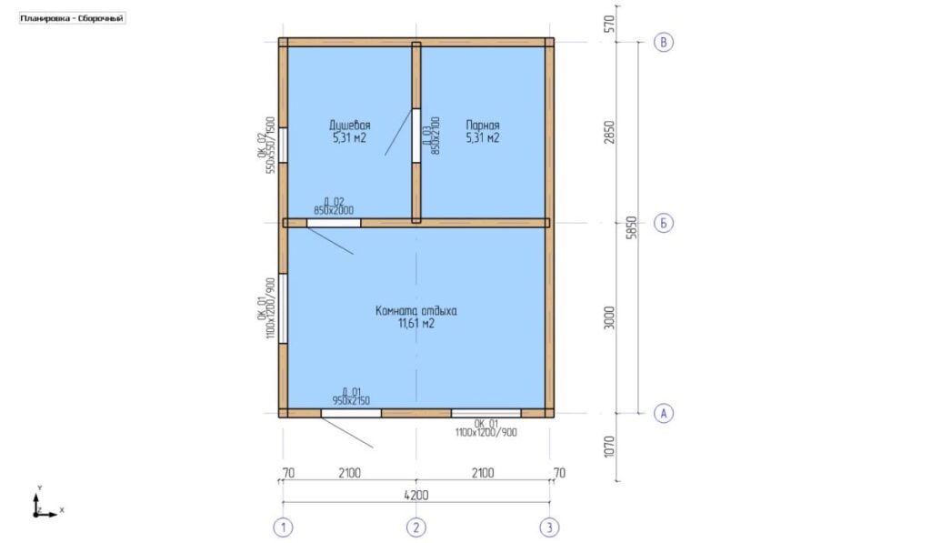 Планировка бани 6х6 включает в себя: